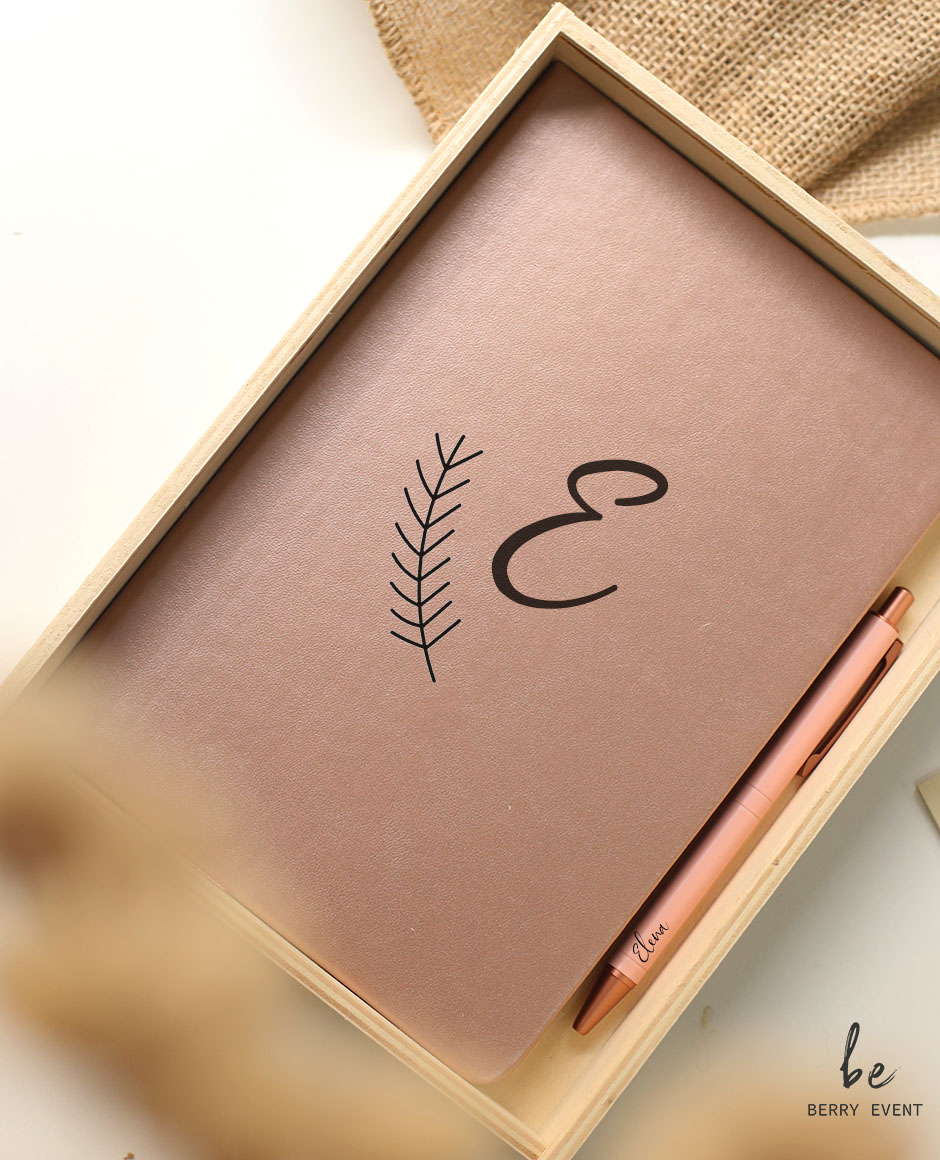 Caja de madera personalizada, incluye libreta y bolígrafo personalizada.