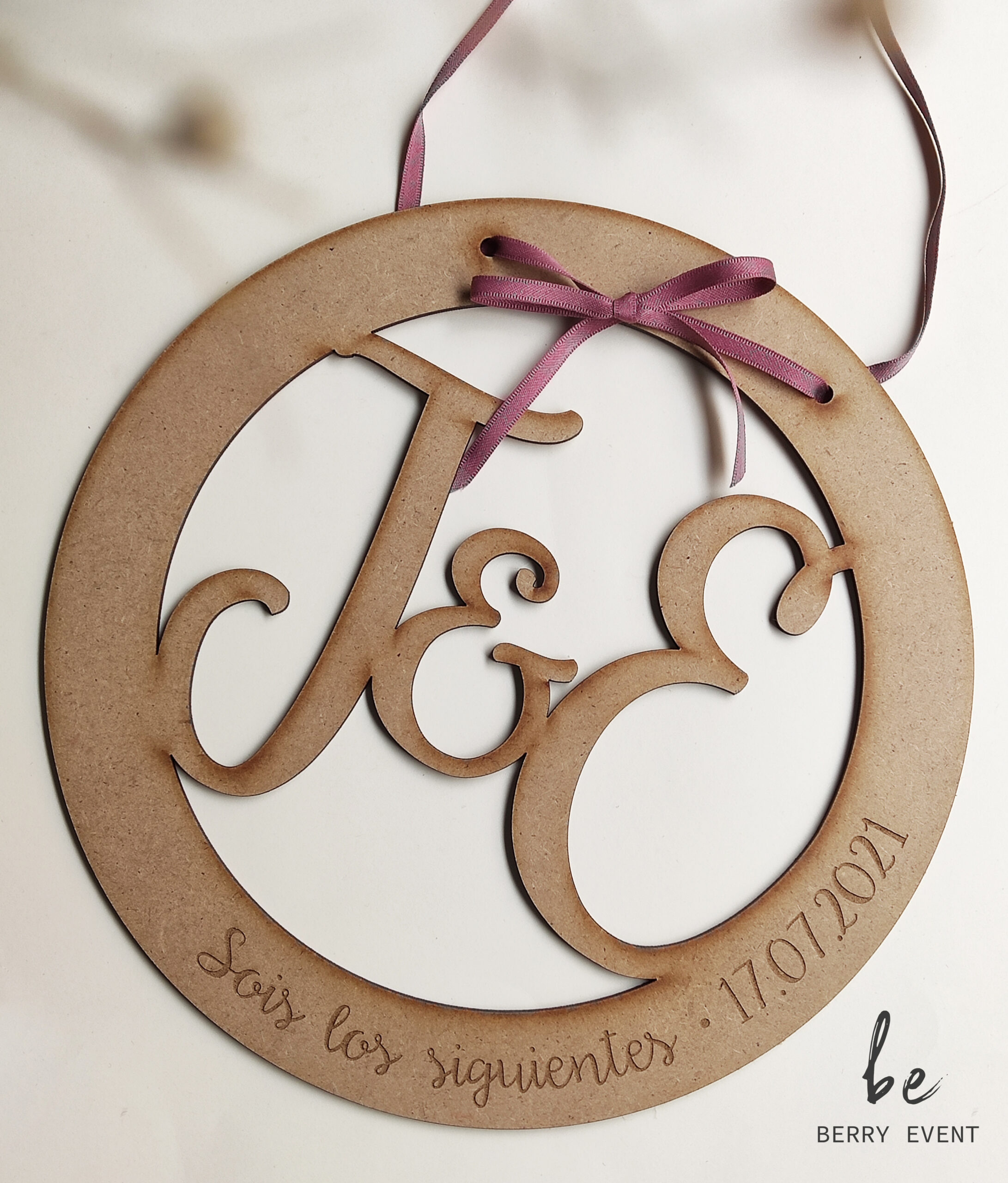 Círculo de madera con iniciales o la opción de poner «SR & SRA» para esa pareja que pronto dará un paso más, vamos a sorprenderles de la mejor forma.