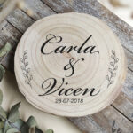 Porta alianzas fabricado con tronco de árbol personalizado con vuestros nombres y la fecha de vuestro día especial. Una idea original, un detalle más que hará que tu día sea exclusivo. También es una idea genial para regalar a esa pareja que pronto dará un «sí quiero», pon sus nombres y si deseas fecha o no para que también puedan tenerlo en su boda.