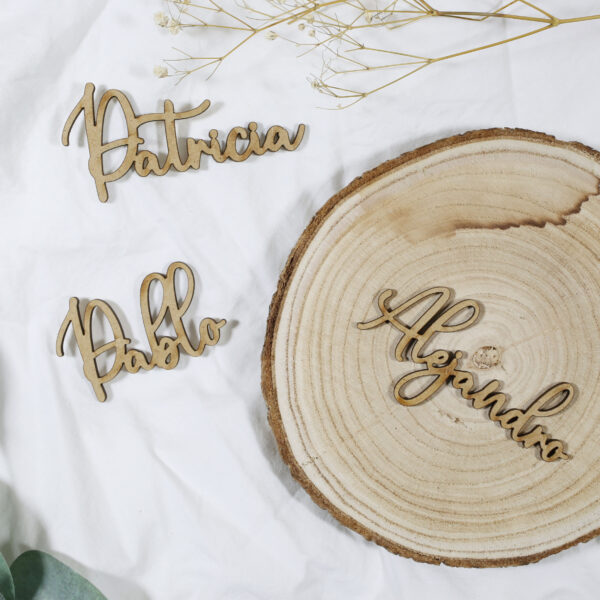 Nombres de madera de aproximadamente de 8 cm de largo. Una forma sencilla y elegante de organizar mesas de evento, decorar tu habitación o cualquier lugar de la casa.