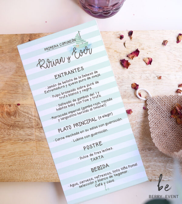 Minuta personalizada con el espectacular menú que vayáis a disgustar en vuestro día. Un detalle que marcará la diferencia. Todos tendrán un recuerdo del gran banquete, además poniéndolo encima del plato de cada uno de tus invitados le darás el toque final de tu increíble mesa.