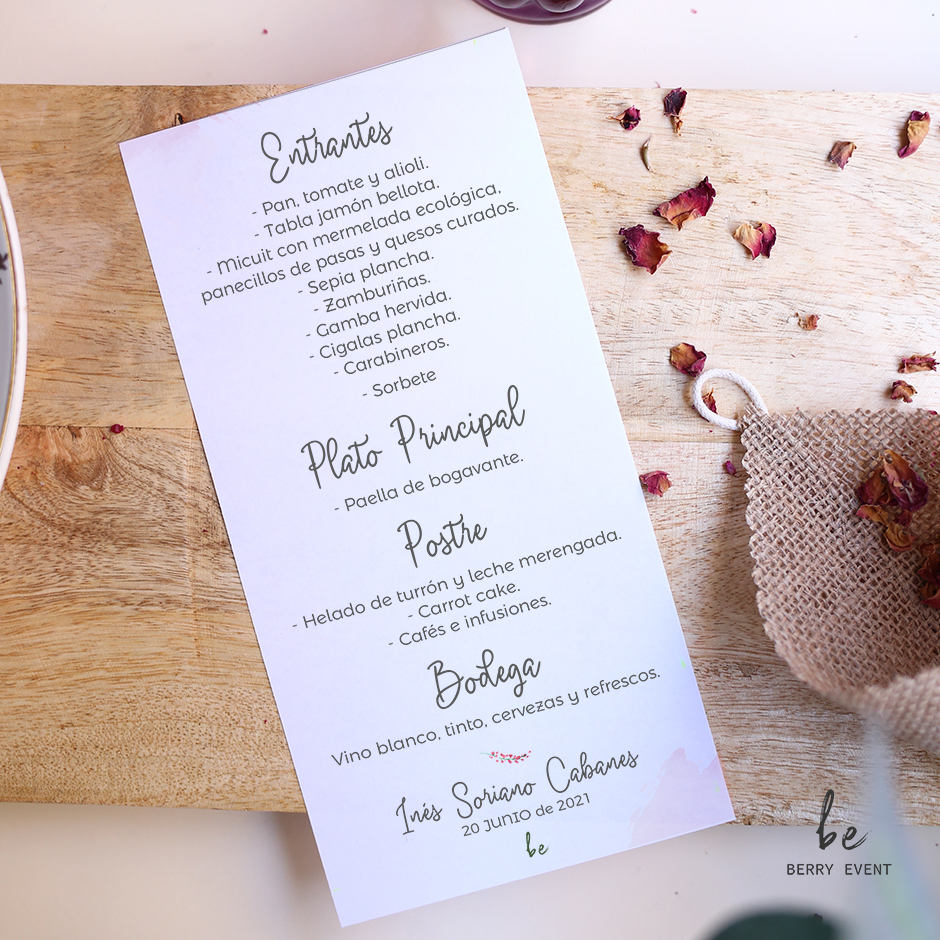 Minuta personalizada con el espectacular menú que vayáis a disgustar en vuestro día. Un detalle que marcará la diferencia. Todos tendrán un recuerdo del gran banquete, además poniéndolo encima del plato de cada uno de tus invitados le darás el toque final de tu increíble mesa.