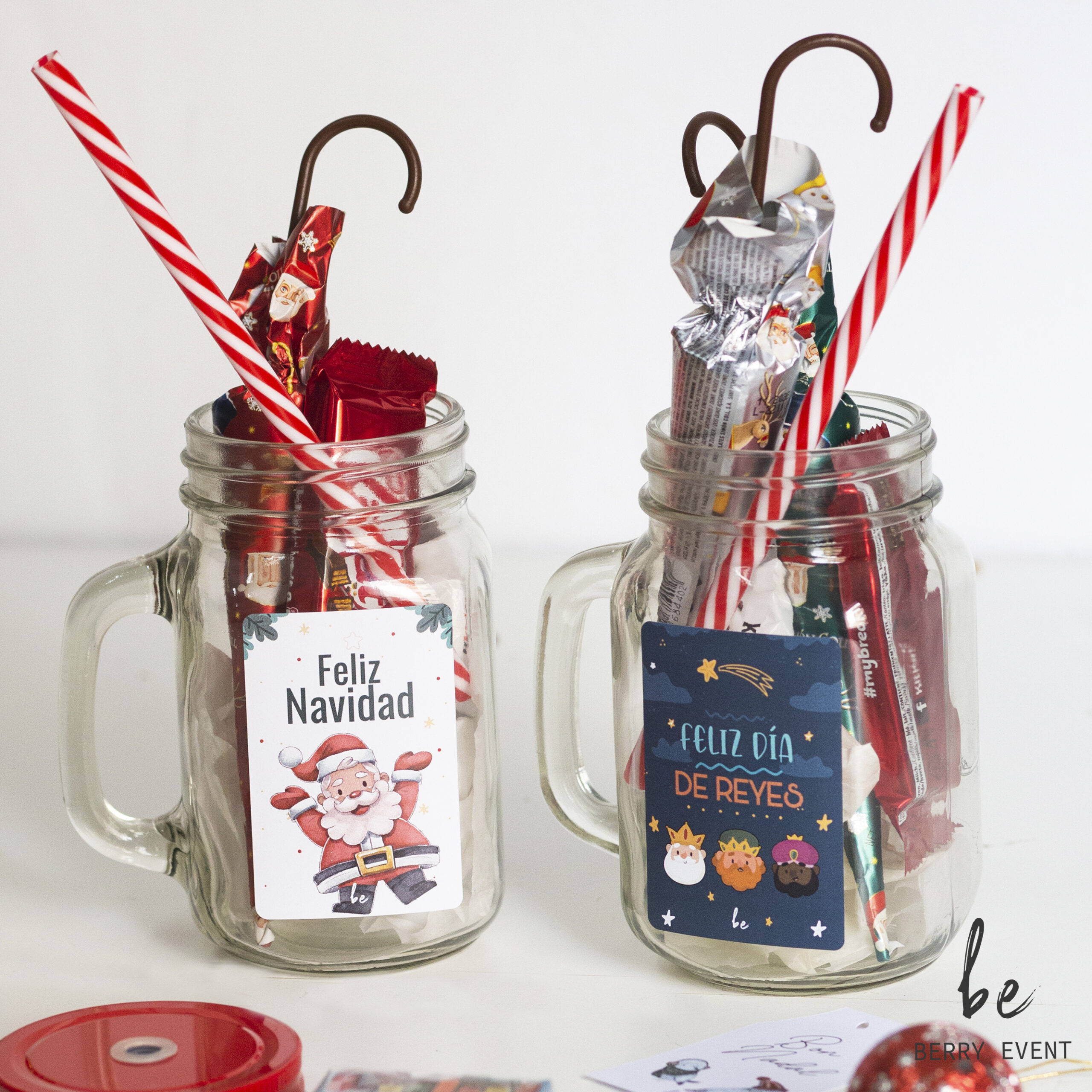 Jarra de cristal con pajita llena de chocolates y dulces navideños. Escoge la temática que prefieras, si eres mas de Santa o de Sus Majestades.