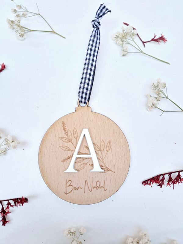 Bola de navidad en madera contrachapada de haya, con inicial en metacrilato blanco y lazo vichy negro. 8 cm.