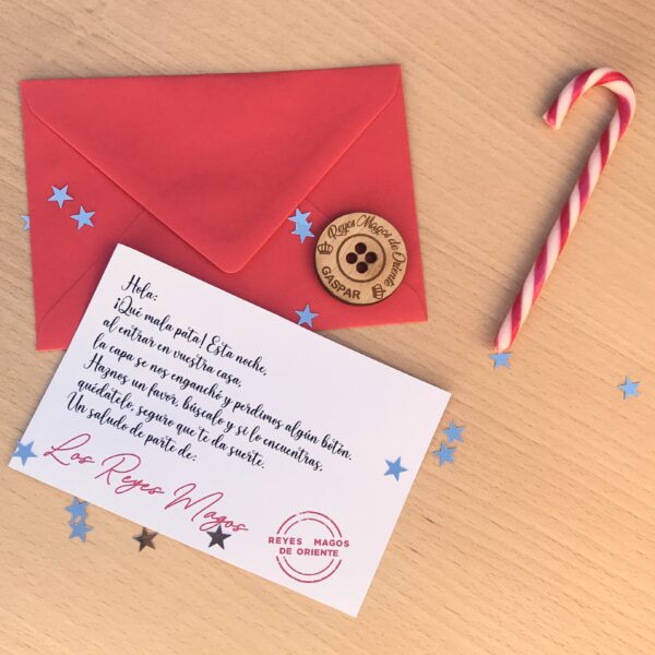 Carta en papel de gramaje superior con sobre rojo. Lleva en su interior botón grabado en madera de haya y confetti navideño. Opción de personalizar la tarjeta.