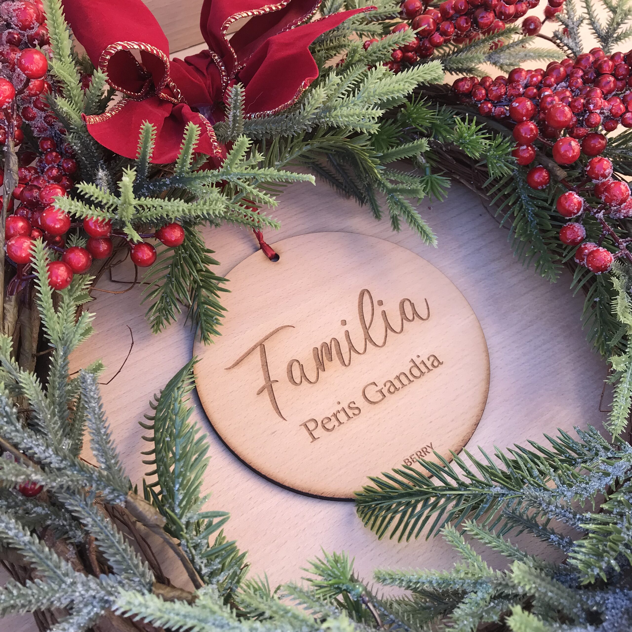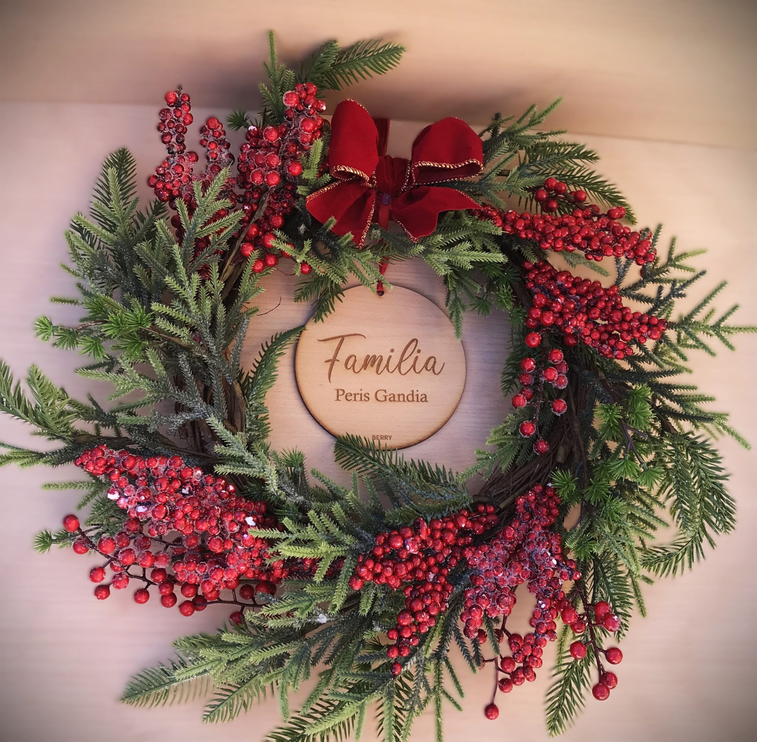 Corona artificial con lazo de terciopelo y placa interior en madera de haya personalizable.
