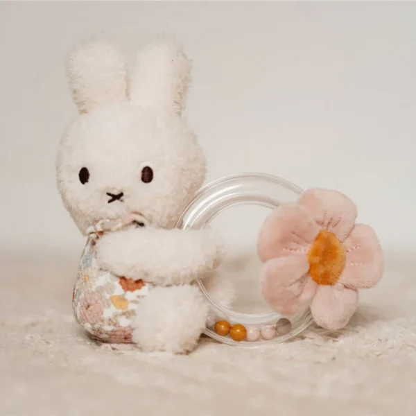 Sonajero en forma de anillo sostenido por la adorable Miffy. Tu bebé podrá agitar el sonajero y escuchar su dulce sonido. Acurrucarse con la flor de peluche, y observar como suenan y se mueven de un lado a otro las cuentas que tiene el anillo. Un juguete ideal para favorecer la coordinación mano-ojo y estimular los sentidos.