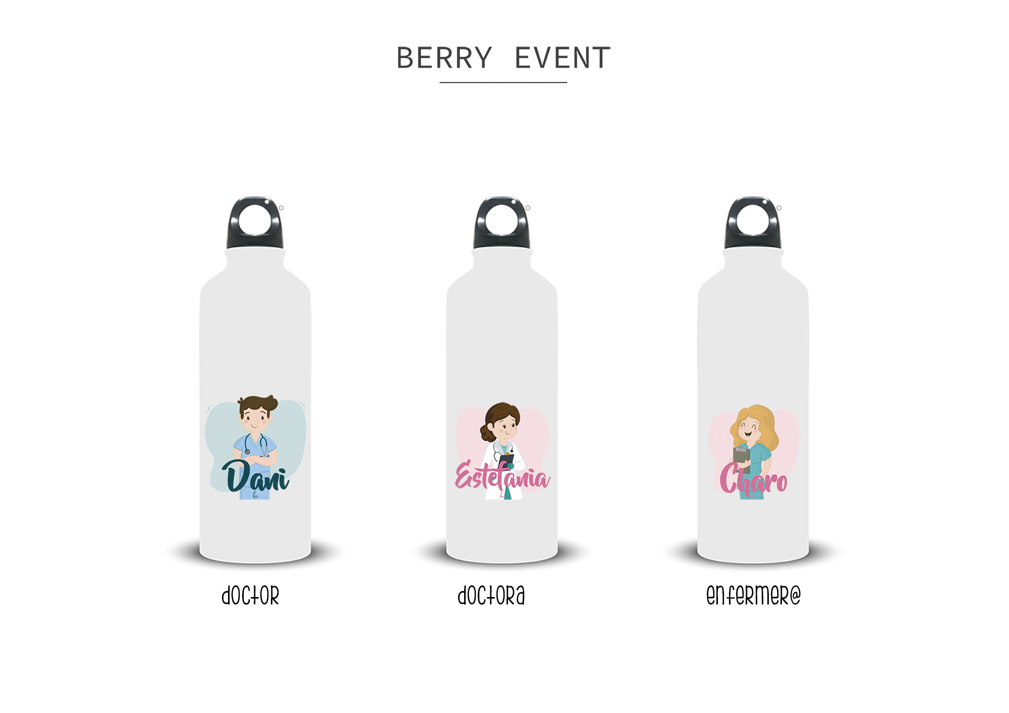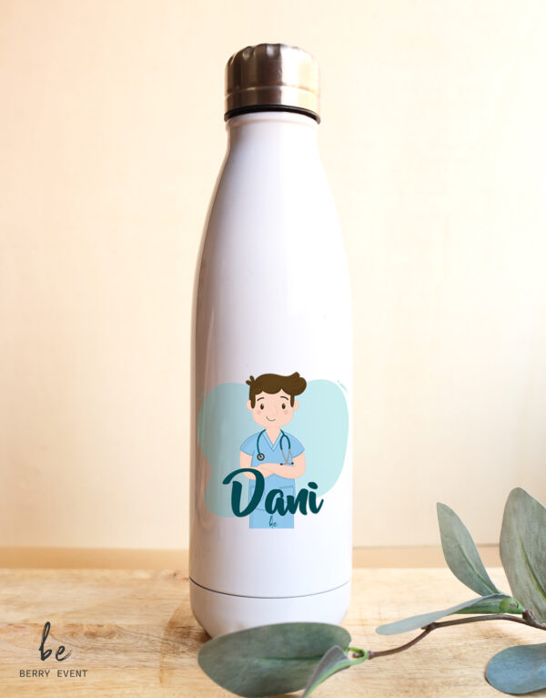 Botella fabricada en acero inoxidable. Capacidad de 750 ml. Sorprende a tus compis de trabajo o a tu doctor@/enfermer@ favorit@ con este bidón personalizado.