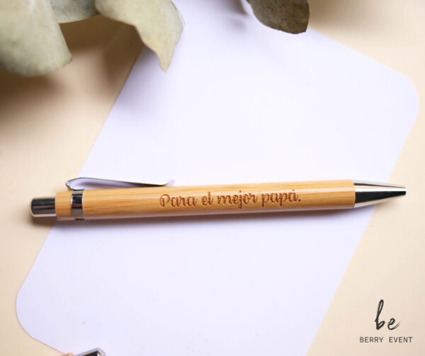 Bolígrafo con cuerpo de bambú y clip fabricado en aluminio de 14 cm. Muy aconsejable para el libro de firmas, regalo para los testigos de tu boda o simplemente un detallazo para los invitados, así todos podrán rememorar el gran día. Puedes acompañarlo con un portalápices a conjunto.