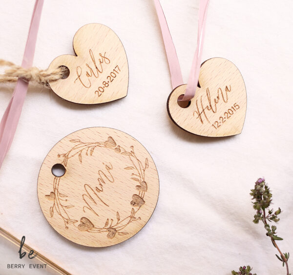 Medalla en madera combinado con un pequeño corazón con el nombre y la fecha de nacimiento de tu peque.