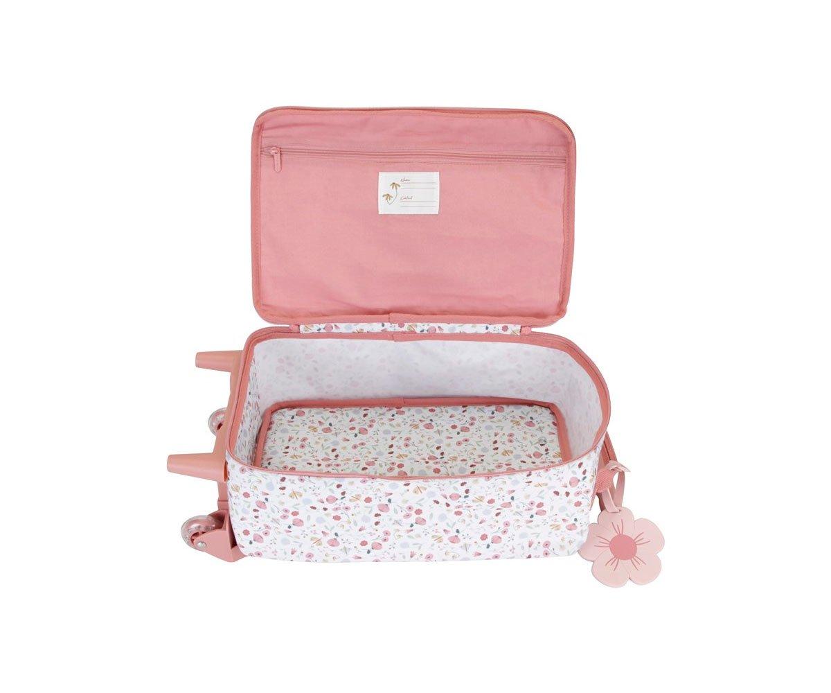 Maleta en color rosa con estampado de flores y mariposas. Es ideal para que los peques lleven su propia ropita y complementos. Cuenta con dos ruedas y dos soportes debajo de la maleta. En la parte superior tiene un asa extensible de una altura máxima de 80cm para que los peques puedan llevarla cómodamente. Incluye un bonito accesorio en forma de flor donde podrás anotar sus datos personales.