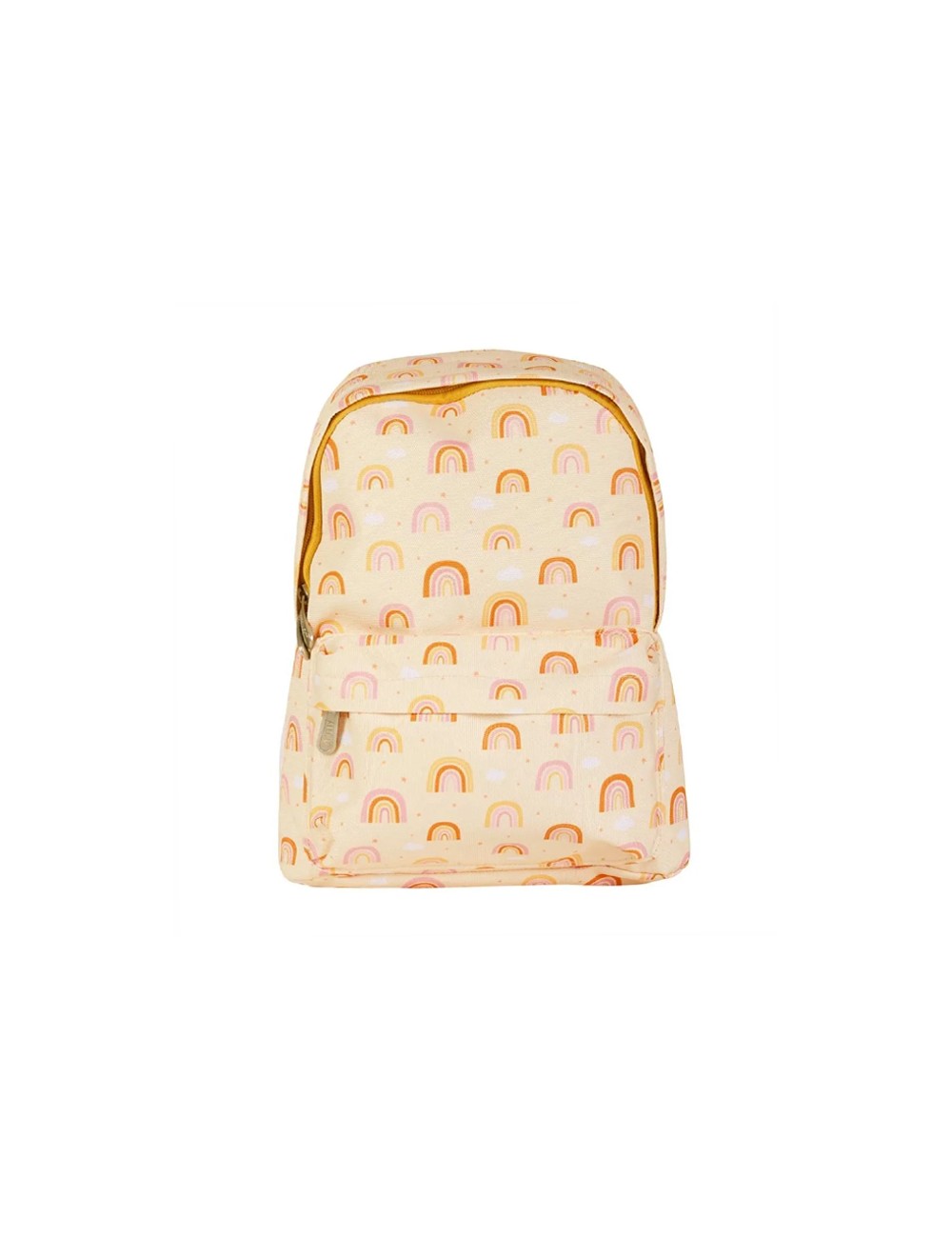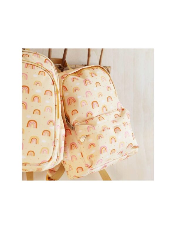 Mochila estampada con bonito diseño de arcoiris en colores suaves. Fabricada en poliéster.