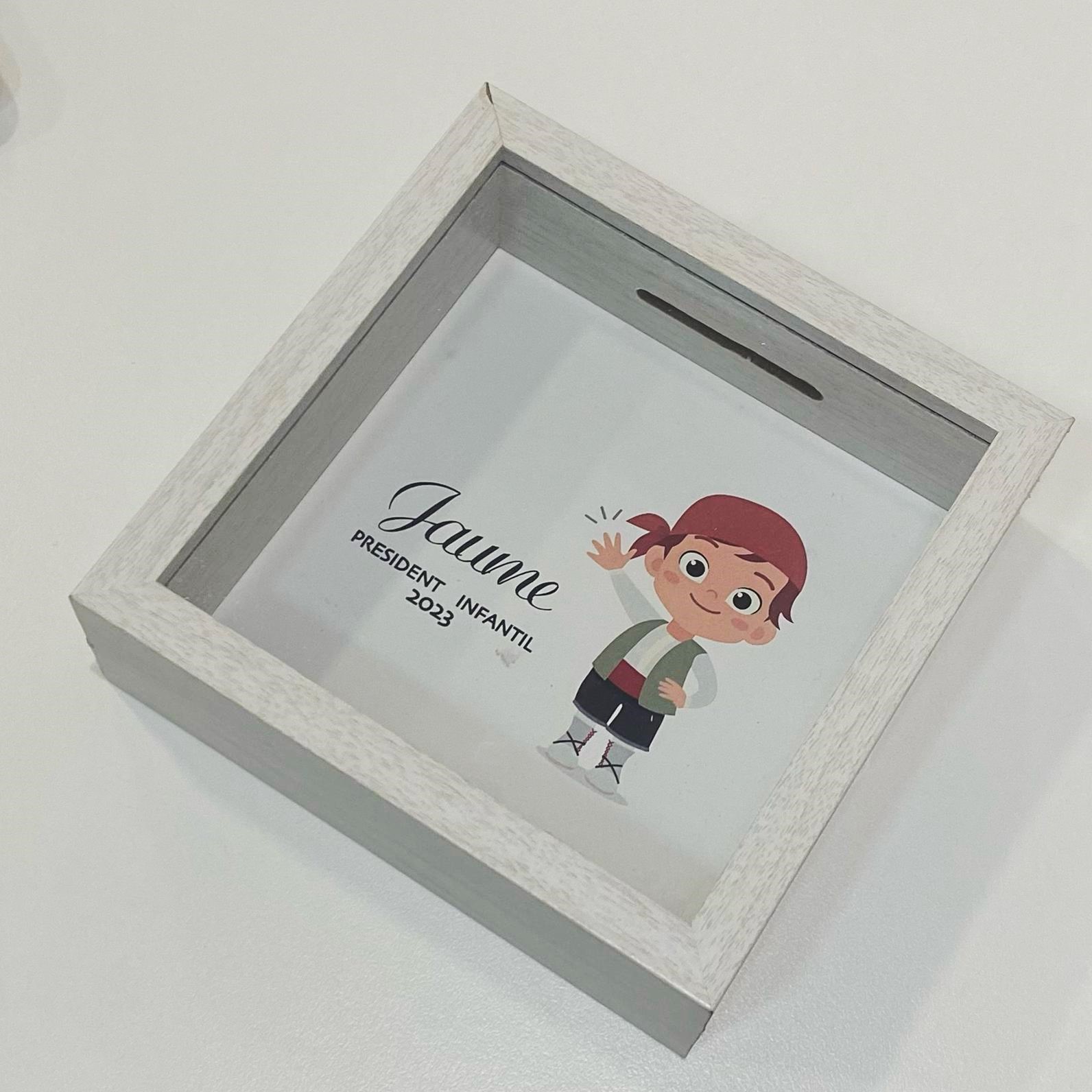 Hucha en madera y cristal con fondo personalizable.