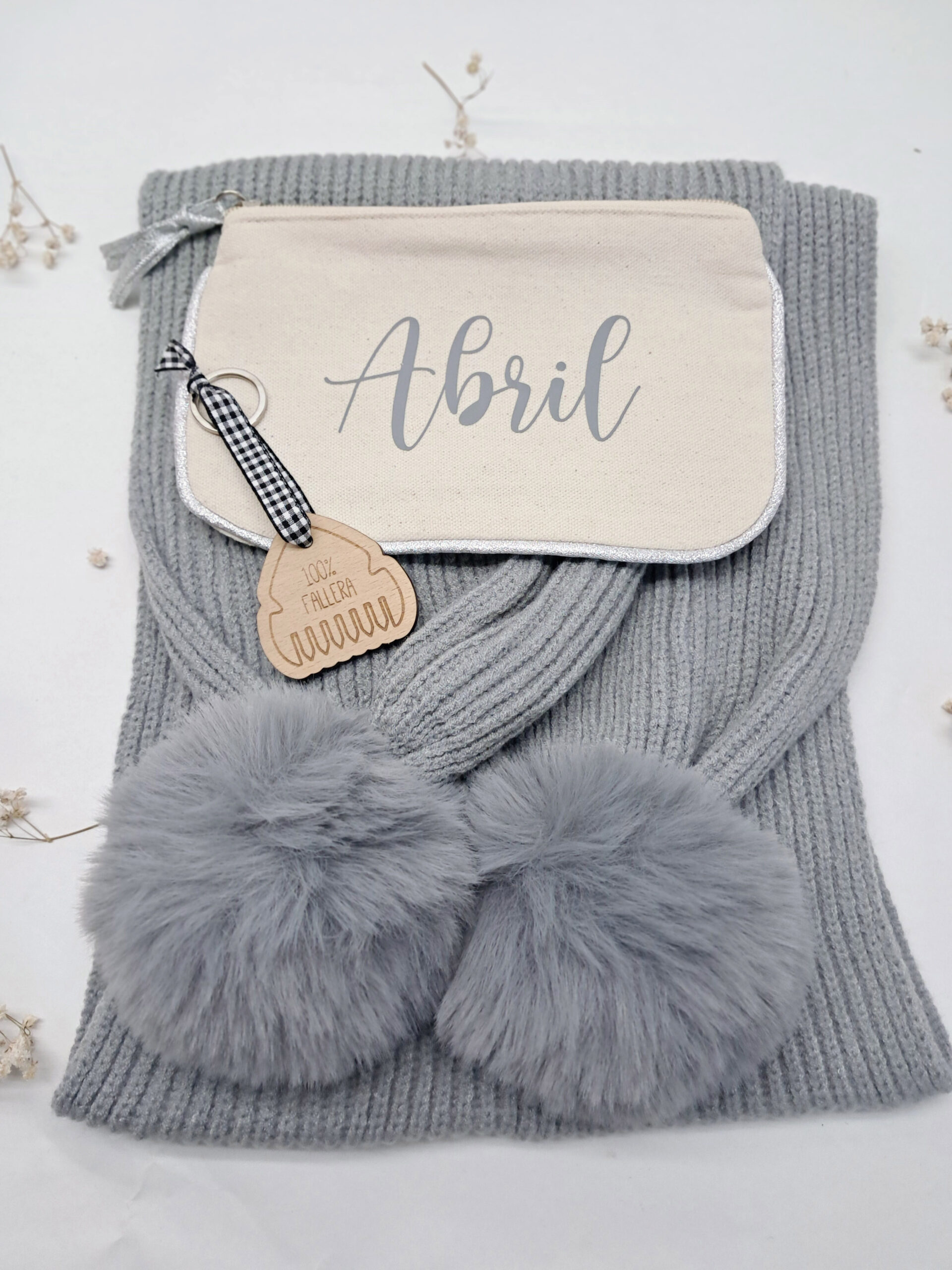 Pack con neceser personalizado + suave bufanda + llavero de madera peineta.
