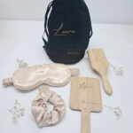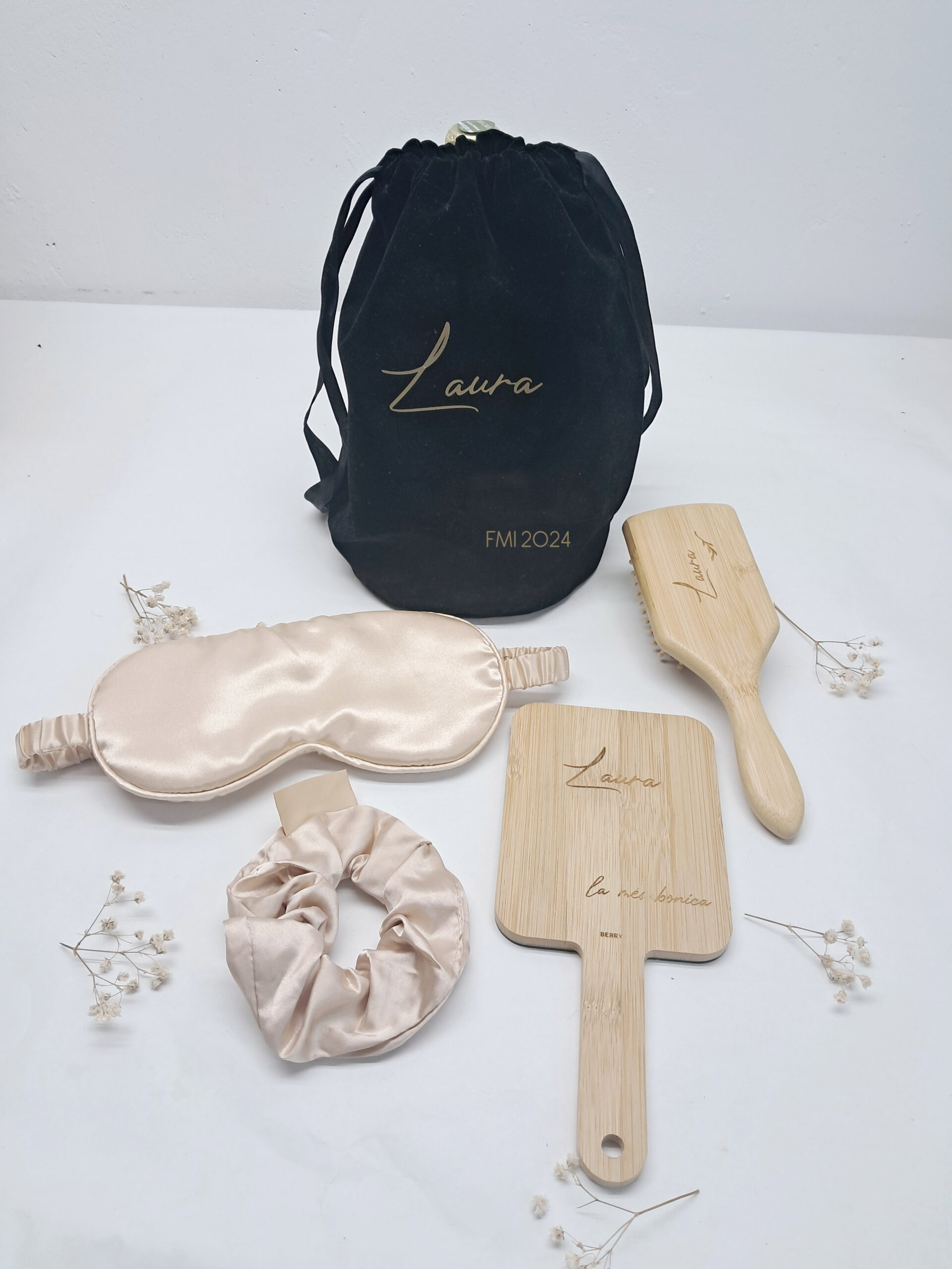 Pack coqueto para regalar completamente personalizado con bolsa terciopelo + cepillo + espejo + coletero + antifaz.