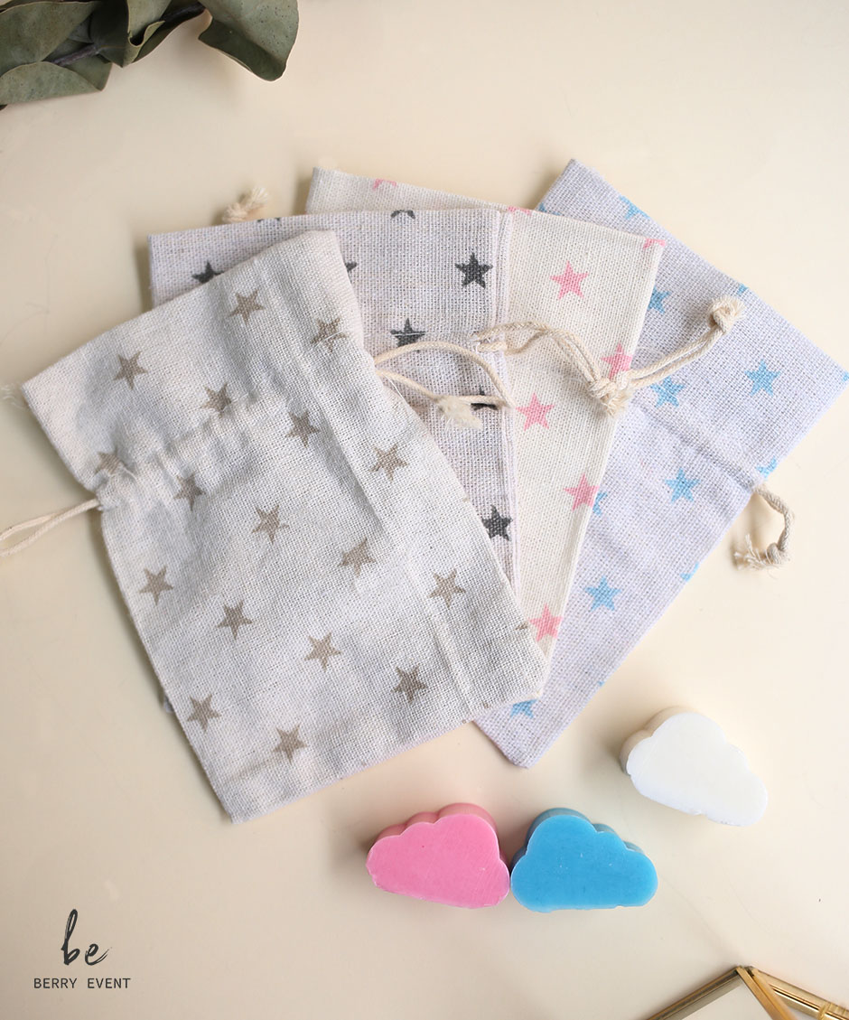 Bolsa estilo lino con estampados de estrellas de diferentes colores, incluyen 2 jabones surtidos en diferente color y aroma.