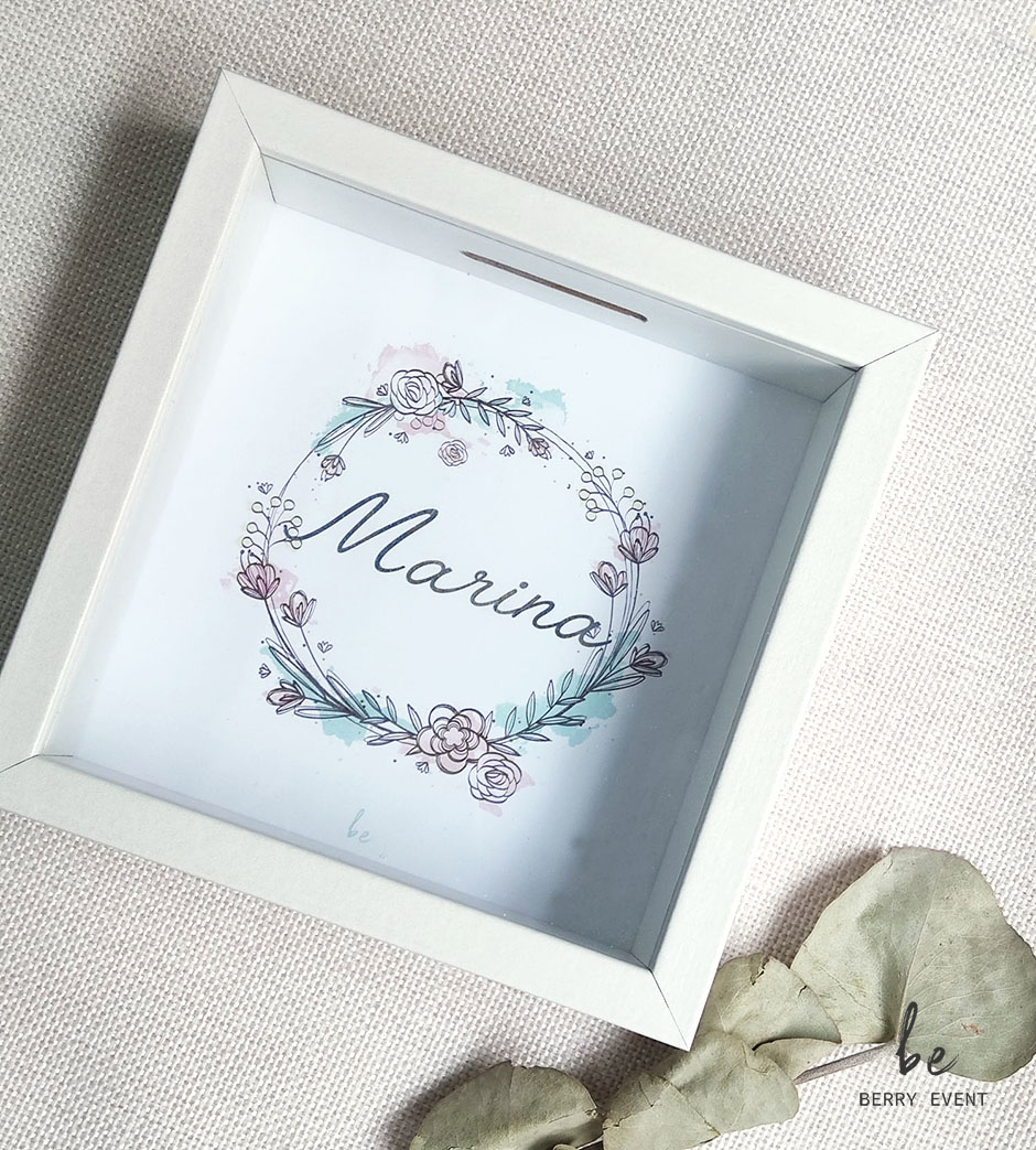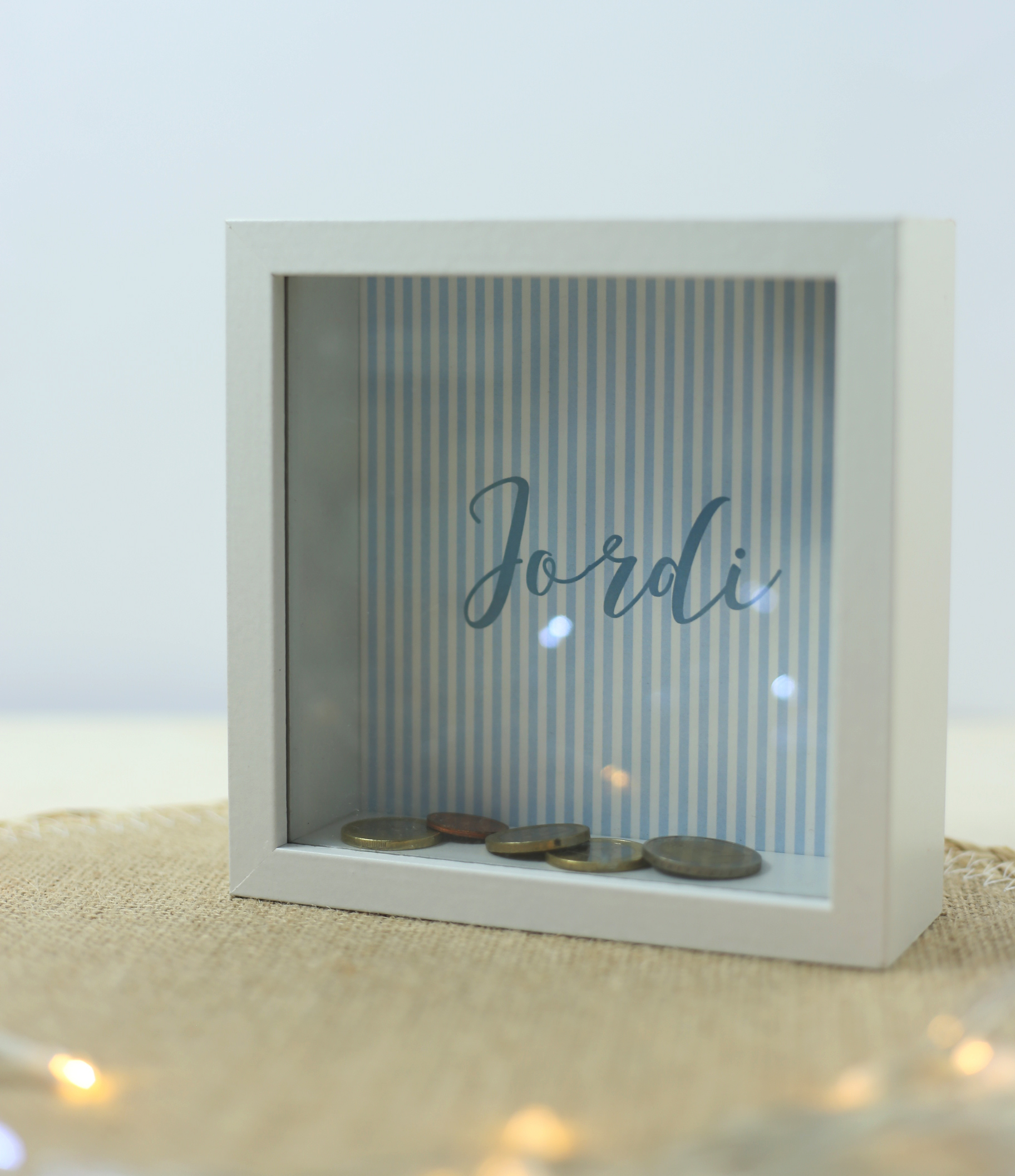 Hucha de madera de 15 x 15 cm  y 5 cm de fondo personalizable con el nombre de tus invitados.