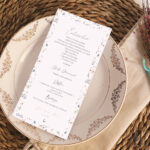 Minuta personalizada con el espectacular menú que vayáis a disgustar en vuestro día. Un detalle que marcará la diferencia. Todos tendrán un recuerdo del gran banquete, además poniéndolo encima del plato de cada uno de tus invitados le darás el toque final de tu increíble mesa.
