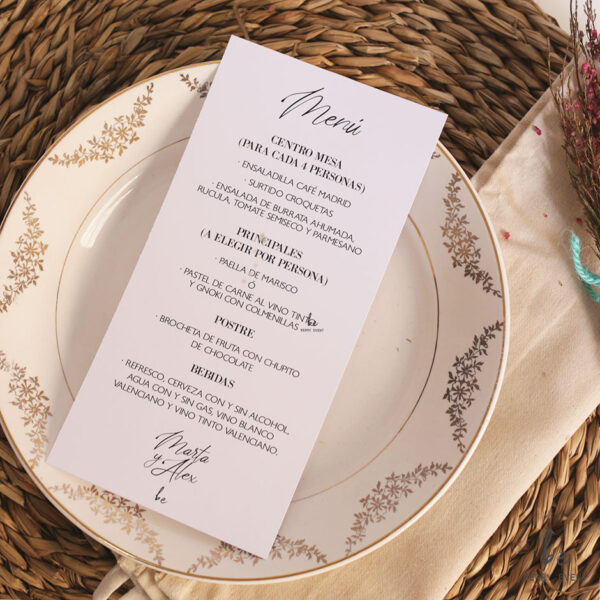 Minuta personalizada con el espectacular menú que vayáis a disgustar en vuestro día. Un detalle que marcará la diferencia. Todos tendrán un recuerdo del gran banquete, además poniéndolo encima del plato de cada uno de tus invitados le darás el toque final de tu increíble mesa.