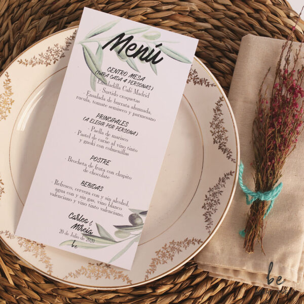 Minuta personalizada con el espectacular menú que vayáis a disgustar en vuestro día. Un detalle que marcará la diferencia. Todos tendrán un recuerdo del gran banquete, además poniéndolo encima del plato de cada uno de tus invitados le darás el toque final de tu increíble mesa.